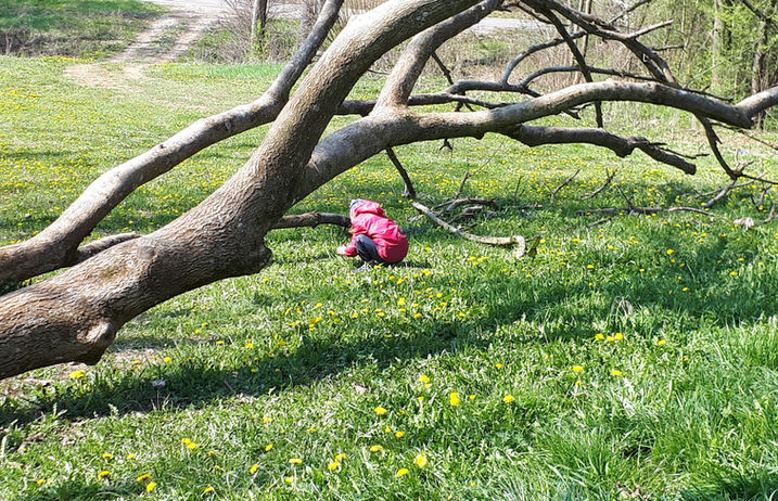 Nach dem Frühstück folgt ein zweites Freispiel im Garten oder dem nahegelegenen Eichenhain. Die Natur bietet hier neue Anregungen und Erlebnisfelder. Im Klettern, Balancieren, Rennen und Springen kann nun der Körper ergriffen und geschult werden. In der Natur finden die Kinder vielfältige Anregungen Ihr Spiel zu gestalten.